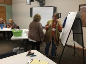 Lydia Johns had a full classroom at the library today, Wednesday, Oct. 16, for her instruction on how to make earrings. The class was held in the multi-purpose room, the only space in the library large enough for this kind of activity. (Actually, it’s the only space we have where we can have a group activity and shut the door, other than the youth department).